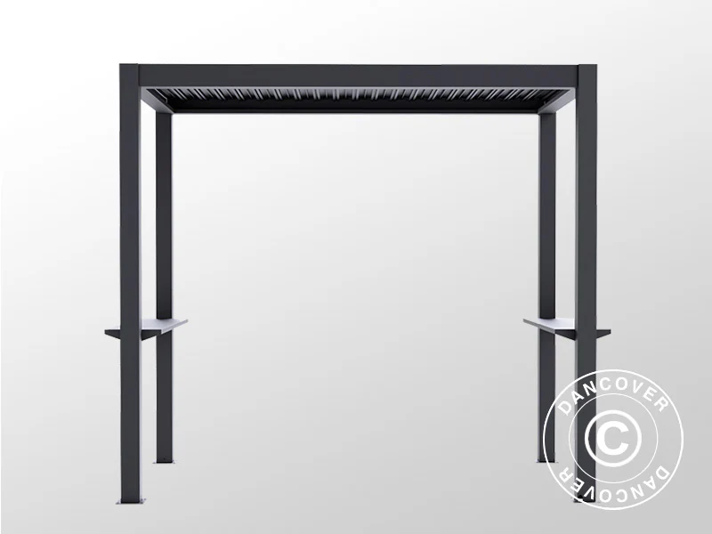 This elegant and functional barbecue pergola with a flexible slat roof will create the perfect setting and workspace for the dedicated barbecue chef. More and more people barbecue all year simply because they love the taste of barbecued food. The pergola is the perfect shelter for BBQ enthusiasts, who can barbecue even when it is raining or snowing. The pergola is made of powder-coated aluminium, which makes the structure maintenance-free. The two shelves or counters at the sides provide room for spices, utensils, and plates – or you can use them as a bar for your guests. The pavilion is easy to assemble and can be placed almost anywhere.
