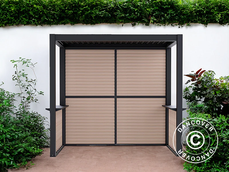 This elegant and functional barbecue pergola with a flexible slat roof will create the perfect setting and workspace for the dedicated barbecue chef. More and more people barbecue all year simply because they love the taste of barbecued food. The pergola is the perfect shelter for BBQ enthusiasts, who can barbecue even when it is raining or snowing. The pergola is made of powder-coated aluminium, which makes the structure maintenance-free. The pergola comes complete with a louvre wall and two side fences. The two shelves or counters at the sides provide room for spices, utensils, and plates – or you can use them as a bar for your guests. The pavilion is easy to assemble and can be placed almost anywhere.
